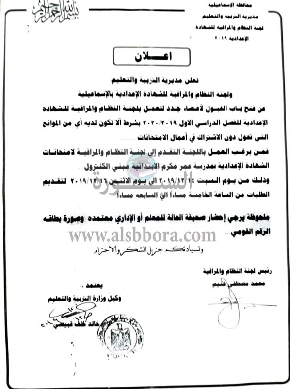 تعليم الاسماعلية تعلن قبول دفعة للعمل بلجنة النظام والمراقبة للشهادة الاعدادية.. مستند