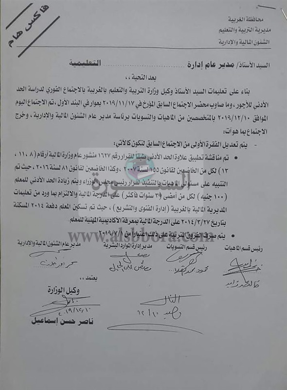 عاجل| التعليم: تطبيق علاوة الحد الأدني لكل الخاضعين لقانون 55 وزيادة الحد الأدني للمعلم 100 جنيها وصرف الفروق اعتبارا من 1 يوليو 2019.. "مستند"