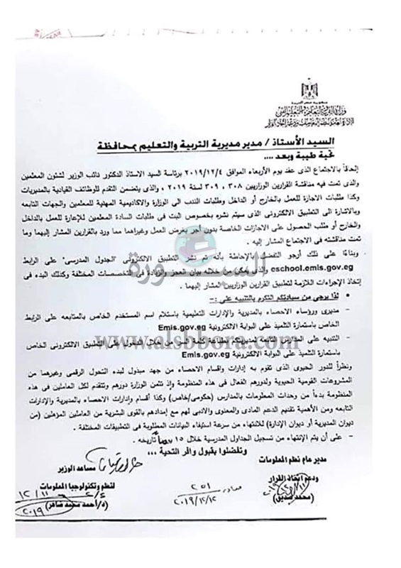 ارسلت وزارة التربية والتعليم فاكسا مهما الى جميع المديريات التعليمية بشأن التطبيق الالكترونى الخاص بالجدول المدرسى لحساب العجز والزيادة.