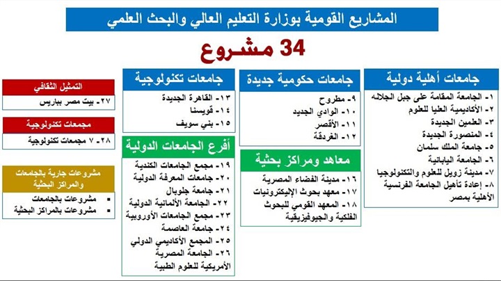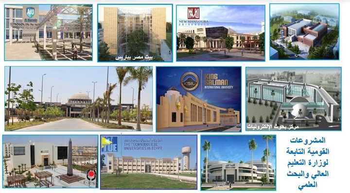 شهدت وزارة التعليم العالي خلال عام 2019 تطورًا فى مجال تنفيذ المشروعات القومية الكبرى بالتعاون مع المؤسسات والجهات المعنية بالدولة، وذلك تنفيذاً لتكليفات السيد الرئيس/ عبدالفتاح السيسى، وخطة التنمية المستدامة للدولة (رؤية مصر 2030)، حيث تنفذ الوزارة حالياً 34 مشروعاً بواقع (8) جامعات أهلية دولية وهى: (جامعة الجلالة، الأكاديمية العليا للعلوم، جامعة العلمين الجديدة، جامعة المنصورة الجديدة، جامعة الملك سلمان، الجامعة المصرية اليابانية للعلوم والتكنولوجيا، مدينة زويل للعلوم والتكنولوجيا، إعادة تأهيل الجامعة الفرنسية الأهلية بمصر)، وكذا (4) جامعات حكومية جديدة وهى: مطروح، الوادى الجديد، الأقصر، الغردقة، و(3) جامعات تكنولوجية بالقاهرة الجديدة، وقويسنا، وبنى سويف، و(3) معاهد ومراكز بحثية وهى: (مدينة الفضاء المصرية، معهد بحوث الإلكترونيات، المعهد القومى للبحوث الفلكية والجيوفيزيقية)، و(8) أفرع للجامعات الدولية وهى:(مجمع الجامعات الكندية، جامعات المعرفة الدولية، جامعة جلوبال، الجامعة الألمانية الدولية، مجمع الجامعات الأوروبية، جامعة العاصمة، المجمع الأكاديمى الدولى، الجامعة المصرية الأمريكية للعلوم الطبية)، بالإضافة إلى عدد (7) مجمعات تكنولوجية، وبيت مصر بباريس للتمثيل الثقافي، فضلا عن مشروعات جارية بالجامعات وأخرى بالمراكز البحثية المتعددة.