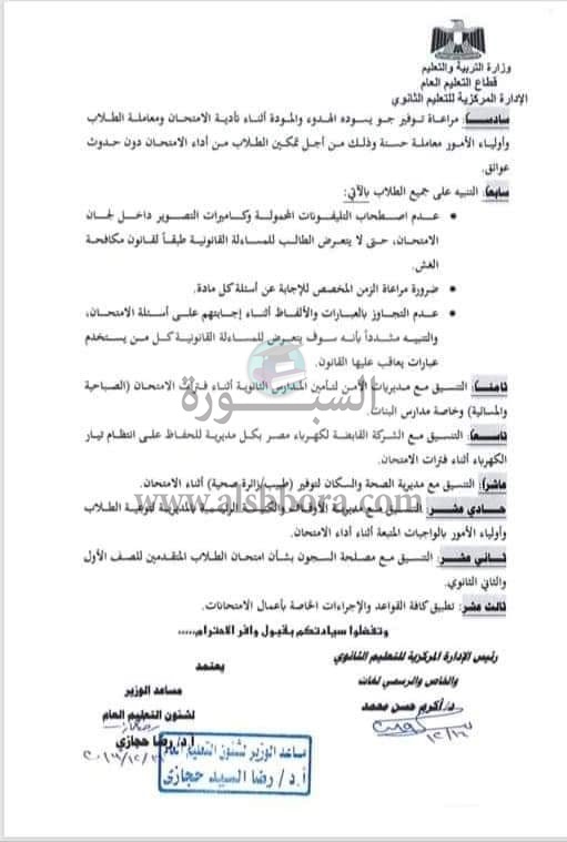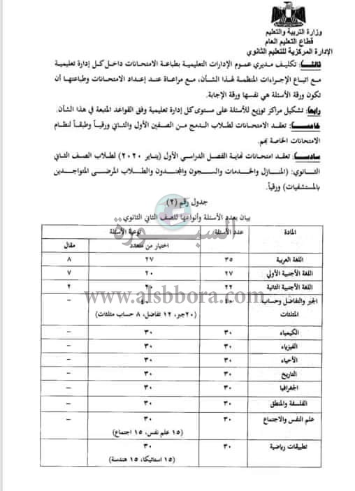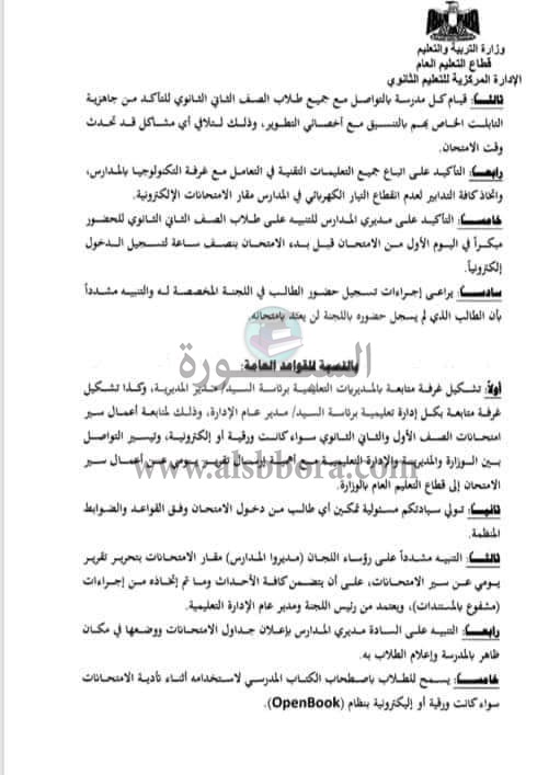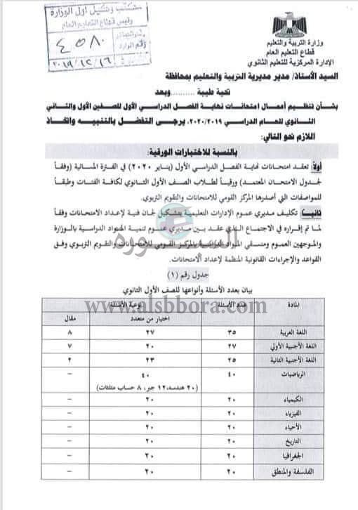 ارسلت وزارة التربية والتعليم خطابا مهما الى جميع المديريات التعليمية بشأن مواصفات امتحانات التيرم الاول للصفين الاول والثانى الثانوى العام للعام الدراسى 2020/2019.
