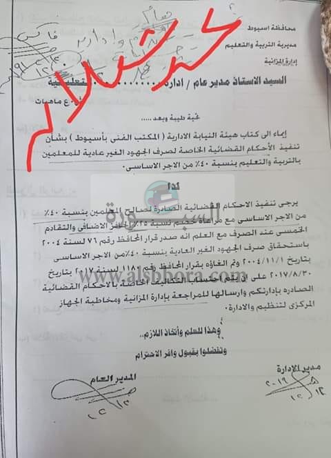 وجاء فى الفاكس " انه ايماء الى كتاب هيئة النيابة الادارية "المكتب الفنى باسيوط" بشأن تنفيذ الاحكام القضائية الخاصة لصرف الجهود غير العادية للمعلمين بالتربية والتعليم بنسبة 40% من الاجر الاساسى".