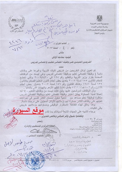 قررت الادارة العامة لشئون العاملين بمديرية التعليم بكفر الشيخ معاملة اوائل الخريجين المعينين بوظيفة اخصائى تدريس او اخصائى تعليم كمعلم مساعد طبقا للكتاب الدورى للجهاز المركزى للتنظيم والادارة رقم 4 لسنة 2012 ويتم معاملتهم مالياً بادراجهم فى حافز الاعباء الوظيفية وليس الحد الادنى للاجور.