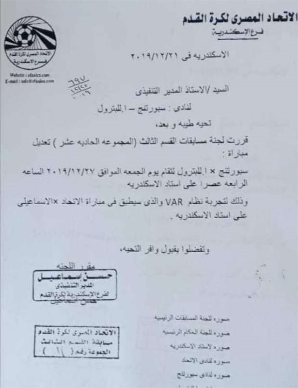 وأخطرت لجنة مسابقات القسم الثالث، الفريقين بتعديل موعد المباراة لتقام الساعة الرابعة عصرا على استاد الإسكندرية، وجاء قرار تعديل المباراة لتجربة نظام الـVAR قبل تطبيق التقنية نفسها في مباراة الاتحاد السكندري والإسماعيلي على استاد الإسكندرية بالبطولة العربية، والمقرر لها السبت المقبل الموافق الثامن والعشرين من ديسمبر الجاري، ضمن منافسات ذهاب دورالثمانية لبطولة كأس محمد السادس.