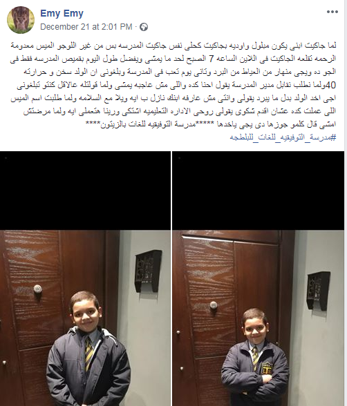 روت احدى اولياء الامور بمدرسة التوفيقيه للغات بالزيتون بتفاصيل اجبار مدرسة لابنها بخلع الجاكيت الخاص بية لانة مخالف لجاكيت المدرسة وقالت ولية الامور التالى: