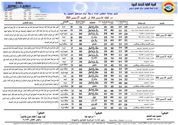 يتوقع خبراء هيئة الأرصاد الجوية، ان يسود غداً الخميس، ﻃﻘﺲ ﻣﺎﺋﻞ ﻟﻠﺒﺮودة ﻋﻠﻰ ﺷﻤﺎل اﻟﺒﻼد ﺣﺘﻰ اﻟﻮﺟﻪ اﻟﺒﺤﺮي واﻟﻘﺎﻫﺮة، ﻣﻌﺘﺪل ﻋﻠﻰ ﺷﻤﺎل اﻟﺼﻌﻴﺪ ﻣﺎﺋﻞ ﻟﻠﺪفء ﻋﻠﻰ ﺟﻨﻮب اﻟﺼﻌﻴﺪ ﻧﻬﺎرا، ﺷﺪﻳﺪ اﻟﺒﺮودة ﻟﻴﻼ وﺗﺼﻞ ﻟﺤﺪ اﻟﺼﻘﻴﻊ ﻋﻠﻰ اﻟﻤﺰروﻋﺎت ﻓﻰ وﺳﻂ ﺳﻴﻨﺎء، وﺗﺘﻜﺎﺛﺮ اﻟﺴﺤﺐ اﻟﻤﻨﺨﻔﻀﺔ واﻟﻤﺘﻮﺳﻄﺔ ﻋﻠﻰ ﺷﻤﺎل اﻟﺒﻼد، ﻳﺼﺎﺣﺒﻬﺎ ﺳﻘﻮط اأﻣﻄﺎر ﻋﻠى اﻟﺴﻮاﺣﻞ اﻟﺸﻤﺎﻟﻴﺔ وﻣﻨﺎﻃﻖ ﻣﻦ اﻟﻮﺟﻪ اﻟﺒﺤﺮى واﻟﻘﺎﻫﺮة، ﻗﺪ ﺗﻤﺘﺪ ﺣﺘﻰ ﺷﻤﺎل اﻟﺼﻌﻴﺪ ﺗﻜﻮن ﻏﺰﻳﺮة ورﻋﺪﻳﺔ اﺣﻴﺎﻧﺎ ﻋﻠﻰ اﻟﺴﻮاﺣﻞ اﻟﺸﻤﺎﻟﻴﺔ، واﻟﺮﻳﺎح أﻏﻠﺒﻬﺎ ﻏﺮﺑﻴﺔ إﻟﻰ ﺷﻤﺎﻟﻴﺔ ﻏﺮﺑﻴﺔ ﻧﺸﻄﺔ ﻋﻠﻰ أﻏﻠﺐ اأﻧﺤﺎء، تؤدى إﻟﻰ اﺿﻄﺮاب اﻟﻤﻼﺣﺔ اﻟﺒﺤﺮﻳﺔ ﻋﻠﻰ اﻟﺒﺤﺮ اﻟﻤﺘﻮﺳﻂ.