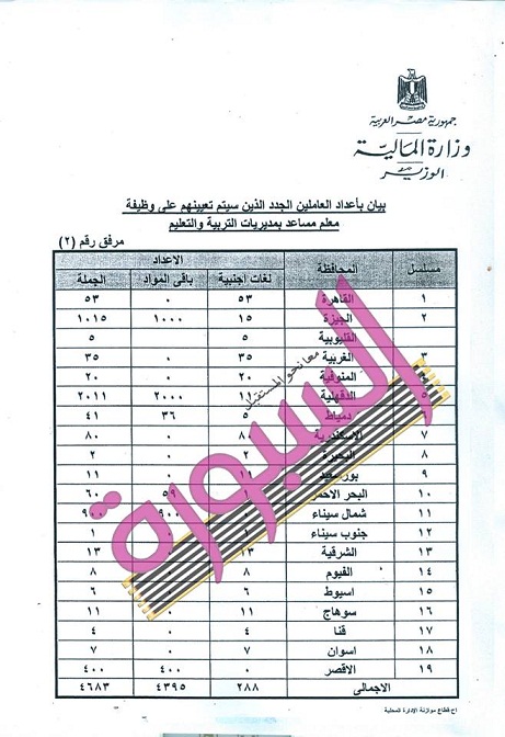 كالاتي : محافظة القاهرة 7650 معلما - الجيزة 17 معلما - القليوبية 11990 معلما - الغربية 7659 معلما ، -المنوفية 7959 - الدقهلية 1945 معلما - دمياط 482 معلما -البحيرة 1990 معلما - بوسعيد 696 معلما -البحر الاحمر 99 معلما - شمال سيناء معلمان - الشرقية 18692 معلما - بني سويف 19 معلما - المنيا 4322 معلما - أسيوط 131 معلما - قنا 9398 معلما - أسوان 2144 معلما .