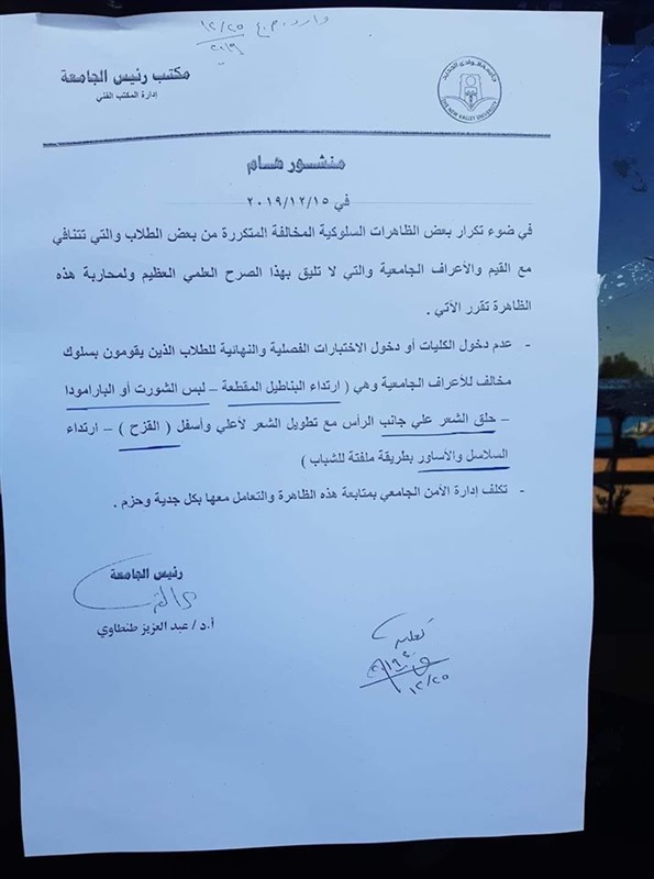 اصدر الدكتورعبدالعزيز طنطاوى رئيس جامعة الوادى الجديد، قرارا ، بحظر دخول الطلاب والطالبات الذين يرتدون البناطيل المقطعة كأحد صيحات الموضة، وكذلك ارتداء الطالبات البرمودا التيشيرت والبنطلونات الضيقة والملفتة للنظر، كما منع الطلاب الذين يقومون بحلق شعرهم بطريقةغريبة فيما يعرف بظاهرة القزح، وتكليف الأمن الجامعى فى جميع الكليات بمنع هؤلاء الطلاب من دخول الحرم الجامعى أو أداء الامتحانات بتلك المظاهرالمخالفة للآداب العامة وسلوكيات الطالب الجامعي.