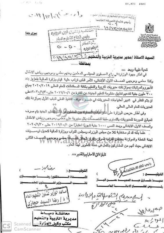 عاجل| التعليم: صرف 1000 جنيه لمعلمي رياض الأإطفال والأول الابتدائي اعتبارا من 1 أكتوبر وحتي 30 يونيو 2020.. ومخاطبة مجلس الوزراء لإدراج معلمي الثاني الابتدائي "مستند"