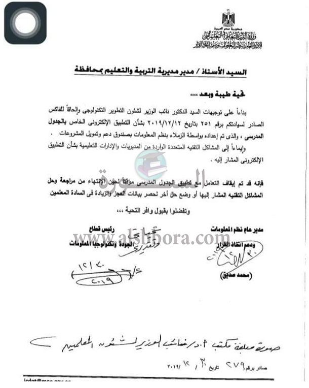 وجاء فى الفاكس الذى تم ارساله الى جميع المديريات التعليمية انه بناء على توجهات الدكتور نائب الوزير لشئون التطوير التكنولوجى والحاقا للفاكس الصادر برقم 251 بتاريخ 12 ديسمبر 2019، بشأن التطبيق الالكترونى الخاص بالجدول المدرسى، والذى تم اعداده بواسطة الزملاء بنظم المعلومات بصندوق دعم وتمويل المشروعات وايماءا الى المشاكل التقنية المتعددة الواردة من المديريات والادارات التعليمية بشأن التطبيق الالكترون المشار اليه.