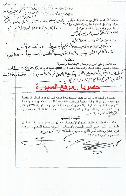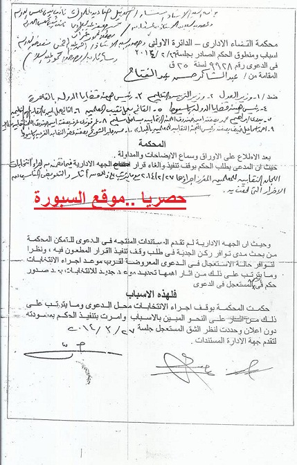 حصلت السبورة على صور للاحكام قضائية الثلاثة التى صدرت من محكمة القضاء الادارى باسيوط والتى قضت فيها جميعا بوقف انتخابات التجديد النصفى المقررة غدا الخميس