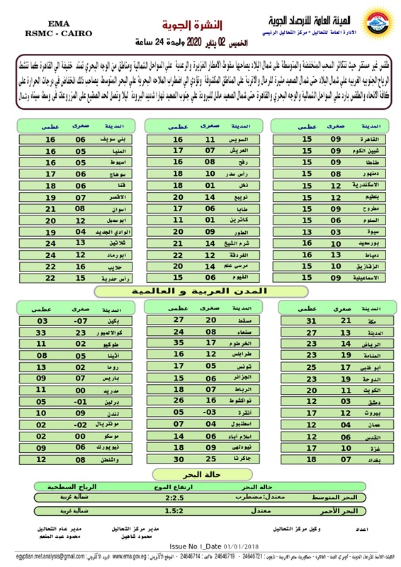 وأوضحت أن الطقس بارد علي السواحل الشمالية والوجه البحري والقاهرة حتى شمال الصعيد مائل للبرودة علي جنوب الصعيد نهارا شديد البرودة ليلا وتصل لحد الصقيع على المزروعات فى وسط سيناء وشمال البلاد.
