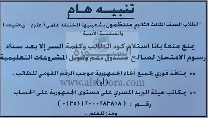 واضافت الوزارة انه يمنع منعا باتا استلام كود الطالب وكلمة السر الا بعد سداد رسوم الامتحان لصالح صندوق دعم وتمويل المشروعات التعليمية بمنافذ فورى بجميع انحاء الجمهورية بموجب الرقم القومى للطالب، او بمكاتب هيئة البريد المصرى على مستوى الجمهورية على هذا الحساب.