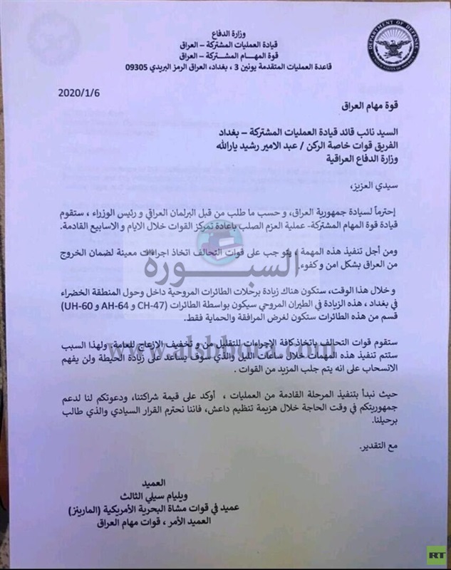عاجل| الجيش الأمريكي يبلغ العراق باتخاذه إجراءات للخروج من البلاد (وثيقة)
