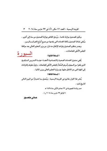 نشرت جريدة الوقائع المصرية قرار المستشار عدلي منصور رئيس الجمهورية، بتعديل بعض أحكام قانون تنظيم الجامعات رقم "49 لسنة 1972".وانشاء صندوق لتحسين احوال العاملين بالجامعات