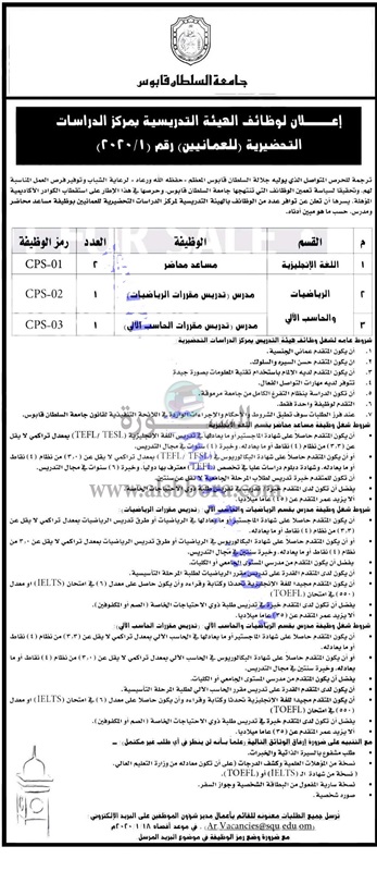 تعلن جامعة السلطان قابوس عن حاجتها الى اعضاء هيئة التدريس، وعلى الراغبين فى الحصول على الوظيفة ارسال السيرة الذاتية عبر الايميل المنشور فى الاعلان التالى على ان يكون اخر موعد للتقديم 18 يناير الجارى.