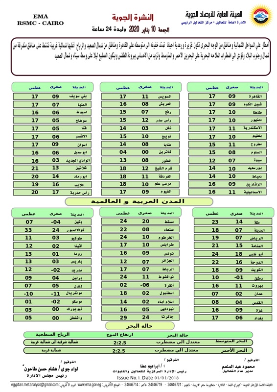وبالنسبة لحالة البحر المتوسط يكون معتدل إلى مضطرب وارتفاع الموج فيه من مترين إلى مترين ونصف والرياح شمالية شرقية إلى شمالية غربية.. وبالنسبة لحالة البحر الأحمر يكون معتدل إلى مضطرب وارتفاع الموج فيه من مترين إلى مترين ونصف والرياح السطحية شمالية غربية.