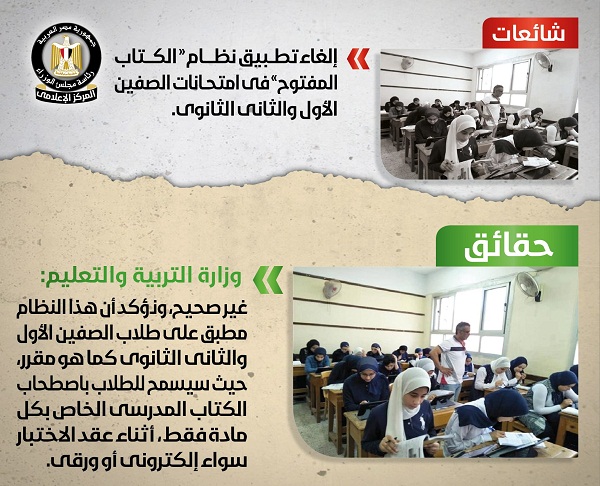 كشف مركز المعلومات بمجلس الوزراء عن الاخبار المتداولة بشأن الغاء تطبيق نظام الكتاب المفتوح فى امتحانات الصفين الاول والثانى الثانوى خلال الترم الاول للعام الدراسى الحالى 2020/2019.