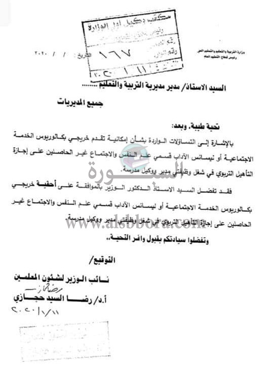 وواق الدكتور الوزير على أحقية خريجي بكالوريوس الخدمة الاجتماعية أو ليسانس الآداب قسمي علم النفس والاجتماع غير الحاصلين على إجازة التأهيل التربوي في شغل وظيفتي مدير ووكيل مدرسة.