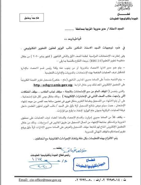 وكذا ضم مدير ادارة الاحصاء بالمديرية او من ينوب عنه مع رؤساء أقسام الاحصاء بالادارات لتشكيل غرف العمليات الخاصة بامتحانات منطومة التعليم للصفي الاول والثاني الثانوي لمتابعة التقرير اليومي الواجب على مديري المدارس الثانوي ( العام او الخاص ) تسجيله الكترونيا على الموقع الذي حددته الوزارة في غضون ساعة واحدة بعد انتهاء الامتحان