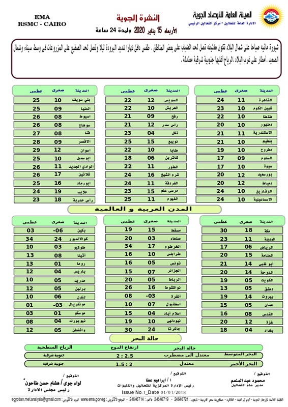 كشف خبراء هيئة الأرصاد الجوية، عن حالة الطقس اليوم الأربعاء ١٥ يناير ، ومن المتوقع أن تكون هناك شبورة مائية صباحا على شمال البلاد، تكون كثيفة أحيانا، تصل إلى حد الضباب على بعض الأماكن.