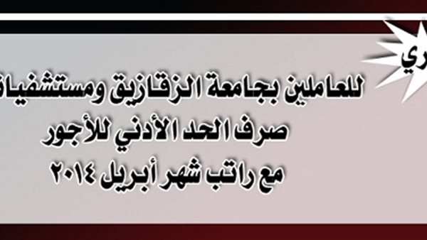أعلن الدكتور أشرف الشيحي رئيس جامعة الزقازيق أنه سوف يتم صرف فروق الحد الأدني للأجور للعاملين بجامعة الزقازيق ومستشفياتها مع راتب أبريل الجاري حيث تم إرسال مندوب لوزارة المالية لإستلام الأمر التنفيذي للصرف . كما سيتم صرف فروق الشهور الثلاثة الأولي يناير وفبراير ومارس مجمعة .