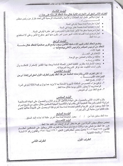 7- البند الرابع فى نموذج لعقد العمل للمعلم المساعد الخا ص بالائحة التنفيذية من القانون 93 لسنة 2012 مذكور به اجازة اعتيادية 15يوم تزاد الى 30 يوم بعد التجديد العقد الحالى غير مذكور به .