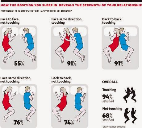 وأضافت الدراسة أن الأغلبية الساحقة من الأزواج (86%) الذين تفصلهم مسافة بوصة واحدة أثناء النوم، يتمتعون بعلاقة زوجية سعيدة مقارنة بـ 66% ممن ينامون على بعد مسافة أكثر من 30 بوصة.