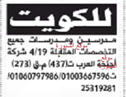 عاجل .. وظائف للمعلمين والمعلمات بالكويت بواسطة شركة اجنحة العرب والمقابلة 19 /4 /2014