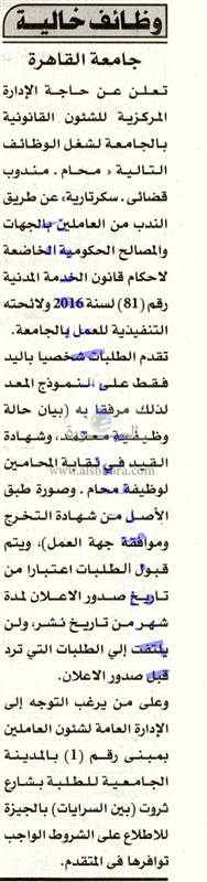 تعلن جامعة القاهرة عن وظائف جديدة شاغرة وفقا لنص الإعلان التالي:-