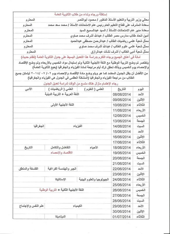 اقترح احد المعلمين جدولا جديدا لامتحانات الثانوية العامة نظام حديث بسبب مادتي الفيزياء والجغرافيا،وقال المعلم حسين الحديدي في رسالته لوزير التربية والتعليم ،علي صفحة الوزارة علي الفيس بوك ، أنه من الأفضل أن يتم وضع امتحان التربية والطنية مع اللغة الاجنبية الثانية ،ويتم استبدال مواد الخميس بمواد الاربعاء ،ويتم وضع الاقتصاد والاحصاء يوم الخميس،وبذلك يتم ترك ايام لمراجعة الفيزياء والجغرافيا "بعبع الثانوية"