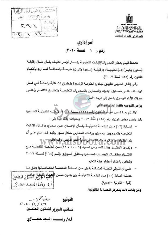وقال فى الامر الادارى تلاحظ فى الايام الاخيرة اعلان بعض المديريات عن فتح وظائف لمدير ووكيل ادارة ومدير ووكيل مدرسة بمخالفة احكام القانون رقم 155 لسنة 2007.