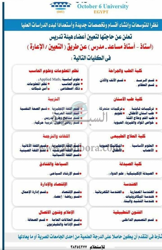 اعلنت جامعة 6 اكتوبر عن حاجتها لتعيين اعضاء هئية التدريس " استاذ – استاذ مساعد – مدرس " عن طريق التعيين اوالاعارة فى كلياتها المختلفة