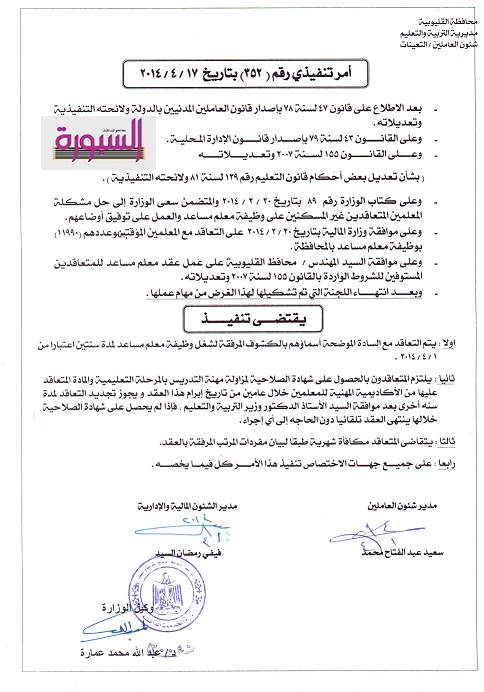 اصدر الدكتور عبدالله عمارة عمارة وكيل اول وزارة التربية والتعليم بمحافظة القليوبية القرار التنفيذي رقم 252 الخاص بتعيين المعلمين المتعاقدين علي درجة معلم مساعد وتضمن القرار