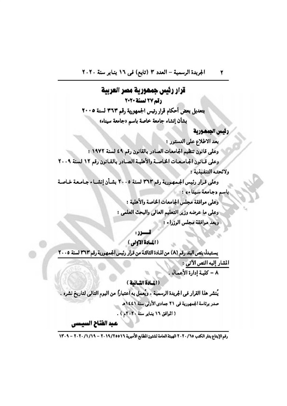 نشرت الجريدة الرسمية في عددها رقم 3 (تابع)، الصادر في 16 يناير 2020، قرار رئيس الجمهورية عبد الفتاح السيسي رقم 27 لسنة 2020، بتعديل بعض أحكام قرار رئيس الجمهورية رقم 363 لسنة 2005، بشأن إنشاء جامعة خاصة باسم (جامعة سيناء).