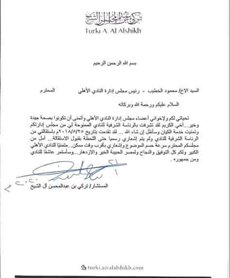 ارسل تركى ال الشيخ ،رئيس الهيئة العامة للترفيه بالمملكة العربية السعودية، برسالة خاصة الى مجلس ادارة النادى الاهلى ،مطالبا مجلس الادارة بحسم أمر "رئاسته الشرفية" للنادي