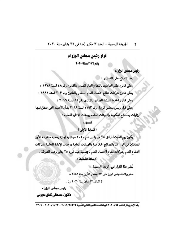 نشرت الجريدة الرسمية في عددها رقم 3 مكرر (هـ) في 22 يناير 2020، قرار رئيس الوزراء الدكتور مصطفى مدبولي رقم 174 لسنة 2020، بشأن أجازة السبت 25 يناير.