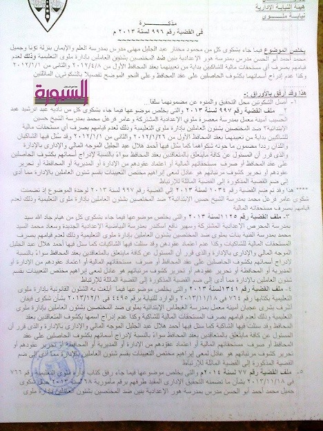 السبورة تواصل حملتها في كشف ملفات وبؤر الفساد فى المديريات التعليمية تقدم كل من العاملين بعقد المحافظ بادارة ملوى التعليمية وهم :- محمود مختار عبد الجليل مهنى –جميل محمد احمد ابو الحسن- نادية عبد الرشيد عبد الحسيب- عامر فرغل محمد- موريس شحاته مسعود- فيفيان اشرف بشرى- هيام جاد الله سيد – اسحاق فوزى سيد اروس خليل بشكوى الى النيابة الادارية ضد المختصين بشئون العاملين بادارة ملوى التعليمية وذلك لعدم صرفهم اى مستحقات مالية للشاكيين بداية من تعينهم بعقد المحافظ ( عقد الاتفاق ) وكذلك عدم ادارج اسمائهم بكشوف الحاصلين على عقد المحافظ اسؤة بزملائهم