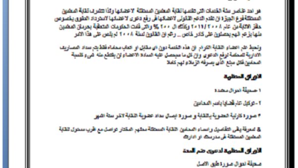 تقدمت نقابة المعلمين المستقلة بالشكرلمركز الحق فى التعليم لدعمه القانونى ( فى قضيتى حافز الاثابة _ وضم المدة ) لاعضاء النقابة حيث تم وبناء على رغبة المعلمين فى باقى المحافظات الاخرى مثل قنا واسيوط والاقصر الدقهلية وبنى سويف والاسماعيلية والقليوبية تم الاتفاق مع عبد الحفيظ طايل رئيس مركز الحق للتعليم بان تكون رفع الدعوى لجميع المحافظات بحيث يتولى واحد منهم جمع الاوراق وارسالها للمركز وتسليمها للمحامين وسيتولون القيام برفع الدعوي