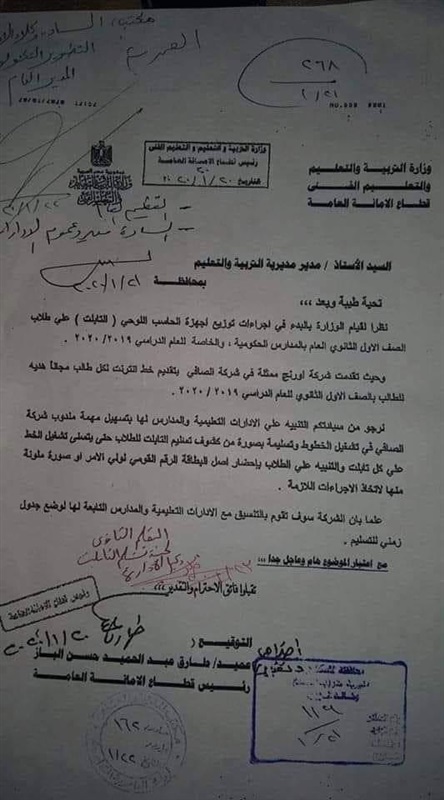 وطالبت وزارة التربية والتعليم والتعليم الفنى، من مديرى المدارس والإدارات بتسليم الشركة كشف بأسماء الطلاب الذين تم تسليمهم التابلت حتى يتسنى للشركة تشغيل الخط على كل تابلت للطلاب مع التنبيه على الطلاب بإحضار بطاقة الرقم القومي لولي الأمر أو صورة منها.