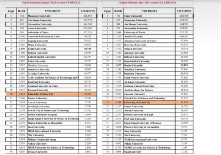 كما حققت المركز ٢٠ من ٣٤ جامعة علي مستوي الجامعات المصرية بدلا من المركز ٢٢ في ٢٠١٩