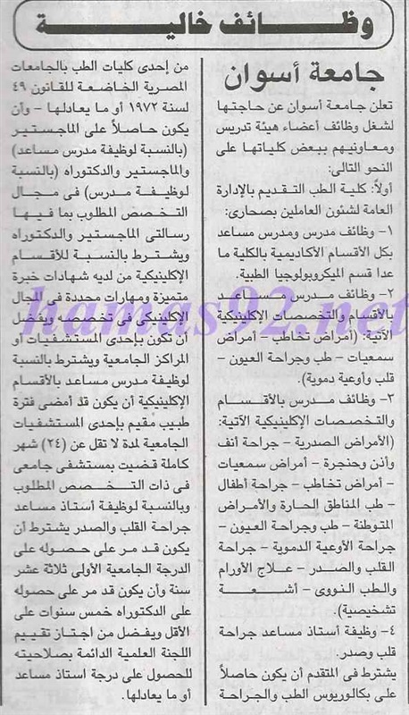 وظيفتك عندنا جامعة اسوان..تطلب اعضاء هيئة تدريس ومعاونين في كليات مختلفة الإثنين 12/مايو/2014 - 04:28 ص facebook twitter whats x facebook twitter rss feed للعمل بجامعة اسوان..إضغط هنا facebook twitter whats
