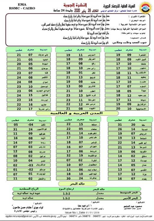 أعلنت هيئة الأرصاد الجوية، عن حالة الطقس اليوم الثلاثاء 28 يناير ،ومن المتوقع أن يسود طقس معتدلًا نهارًا شديد البرودة ليلًا غائمًا أحيانًا والرياح معتدلة مع وجود شبورة صباحية بالوجه البحرى والقاهرة الكبرى وشمال الصعيد.