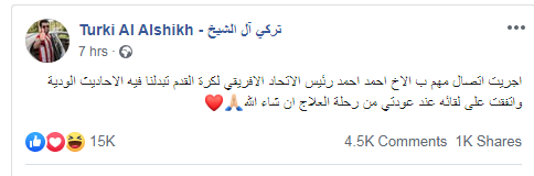 وكتب آل الشيخ خلال تدوينة أخرى: "أجريت اتصال مهم بالأخ أحمد أحمد رئيس الاتحاد الأفريقي لكرة القدم تبدلنا فيه الأحاديث الودية واتفقت على لقائه عند عودتي من رحلة العلاج إن شاء الله".