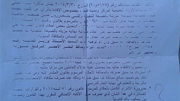 ارسلت وزارة المالية خطابا رسميا الي مديرية التربية والتعليم بقنا، قالت فيه بالاشارة الى كتابكم رقم 175+م20 المؤرخ فى 30/3/2014 بشأن مذكرة ممثلى الادارة التعليمية لمركز ومدينة قفط بخصوص الافادة بالرأى عن كيفية حكم القضائية النهائية المزيلة بالصيغة التنفذية والتى يتضررون من خصم مكافأة الامتحانات من قيمة حافز الاثابة الـ200% القرار المرسوم بالقانون رقم 51 لسنة 2011 قطاع الموازنه العامة للدولة للسنة المالية 2011/2012 بتعديل بعض احكام الضريبة على الدخل على الرغم من حصولهم على احكام قضائية نهائية مزيلة بالصيغة التنفيذية لها حجتها بموجب صرف الحافزمع عدم المساس بالمكافاة السنوية