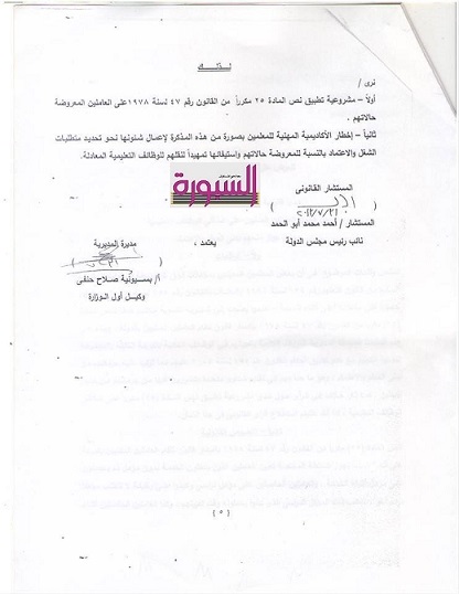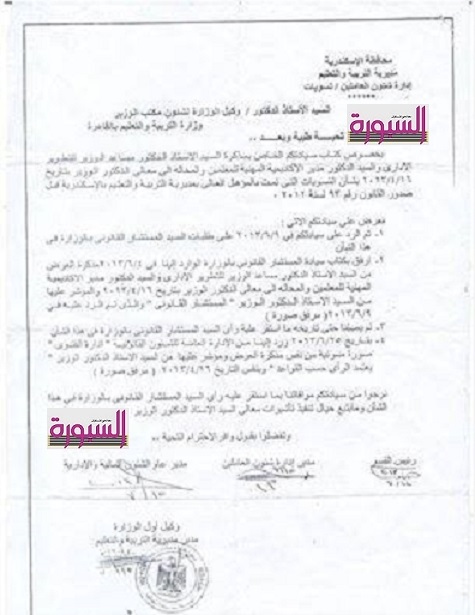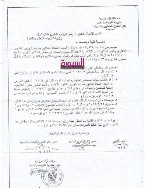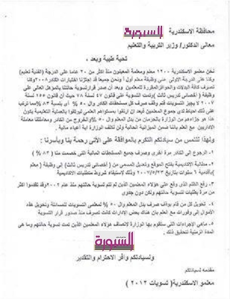 معلمو تسويات الاسكندريه يناشدون محلب حل مشكلتهم..والسبورة تنشر المستندات التي تؤكد حقوقهم
