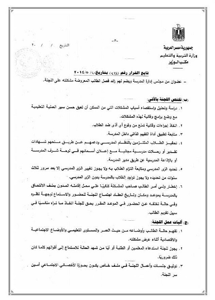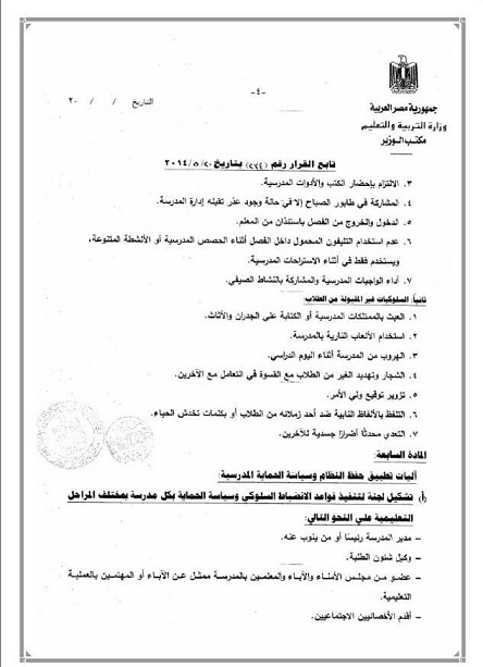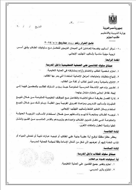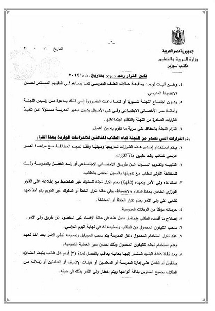 السبورة تنشر القرار الوزاري رقم 234 بتاريخ 20/5/2014 بشأن حفظ النظام والانضباط داخل المدرسة