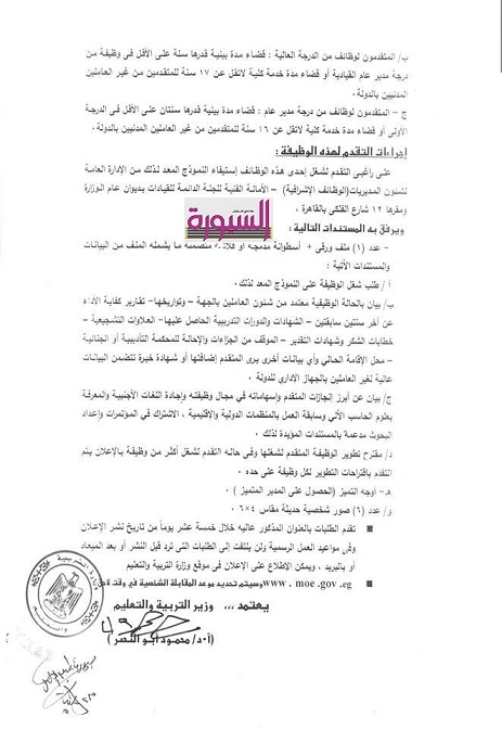 اعلنت وزارة التربية والتعليم عن حاجتها لشغل 34 وظيفة قيادية بديوان عام الوزارة والمديريات التابعة لها وهي 3 وظائف للدرجة الممتازة و22 وظيفة للدرجة العليا و9 وظائف لدرجة مدير عام وذلك طبقا لاحكام قانون نظام العاملين المدنين بالدولة وبالقانون رقم 47 لسنة 1987 وتعديلاته