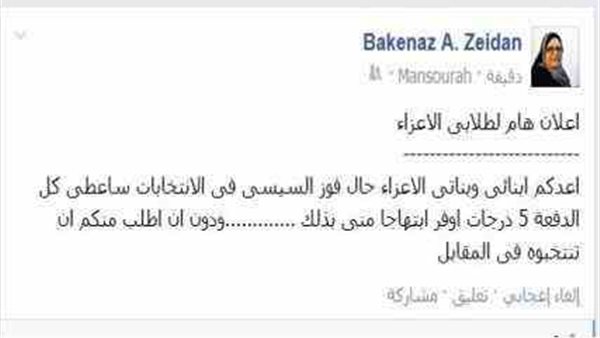 قالت الدكتورة باكيناز زيدان استاذة هندسة المياه بجامعة طنطا ان البوست الذي تداوله البعض لها وانفردت السبورة بنشره عن منحها 5 درجات للطلاب في حالة فوز السيسي كان هزار مع طلابي وليس أمر جد