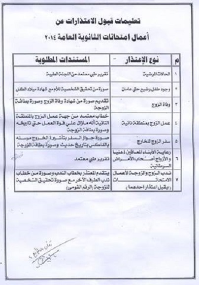 بدأ امس فتح باب قبول الاعتذارات عن أعمال امتحانات الثانوية العامة 2014 دور أول خلال الفترة من ويستمر حتي الاربعاء 2014/6/4 من الساعة الثالثة عصراً وحتى الساعة السابعة مساءً وفق الضوابط المحددة .. على أن يتم تقديم الطلب بإسم السيد رئيس لجنة الادارة مرفقاً به خطاب الندب والمستندات المؤيدة لسبب الاعتذار
